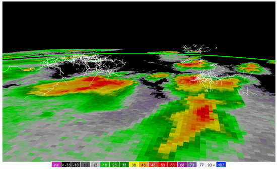 Raw lightning data were retrieved from the DCLMA at 1 min intervals using the lightning ingest algorithm. This algorithm gathers data and creates an index for processing (w2lmaflash) [26]. Lightning flash density products were created using the lightning algorithm (w2ltg) [26] and these data were assembled to view 3D lightning channels and flash initiation points for isolated cells. We used the default flash algorithm thresholds, where each VHF source had to be within 300 ms and 5 km from one another [26]. Furthermore, flashes also had to have a minimum of three VHF sources to eliminate potential noise [33,34]. The lightning products were then added to the WDSS−II software and overlaid on radar data at 1 min intervals (Figure 4).