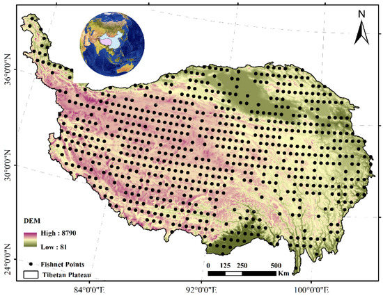 The Tibetan Plateau (26°00′–39°47′ N, 73°19′–104°47′ E), located in southwestern China (Figure 1), is the highest and most extensive plateau in the world, with an average altitude exceeding 4000 m [42]. The typical continental plateau climate is characterized by low temperatures and limited precipitation; the winter is long, cold, and windy, whereas the summer is cold and rainy, with frequent hail [43]. The temperature and precipitation have distinct regional distribution patterns in this area, with a mean annual air temperature (MAT) ranging from −15 to 20 °C and mean annual precipitation (MAP) ranging from 50 to 700 mm from the northwest to the southeast [44]. More than 63.5% of the area of the Tibetan Plateau is covered by alpine desert steppe, alpine steppe, and alpine meadow. Alpine grassland is the dominant ecosystem on the plateau, and the vegetation is alpine meadow (dominated by Kobresia and Poa species) and alpine steppe (dominated by Stipa purpurea and Stipa subsessiliflora) [45]. The other vegetation types on the Tibetan Plateau include forest, shrub, and wetland.