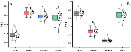 Variations in VSP (A) and VST (B). The gray, red, blue, and green points represent spring, summer, autumn, and winter, respectively.