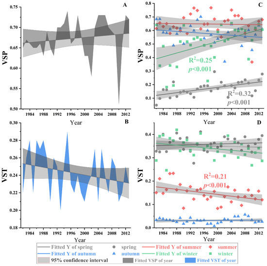 Temporal variability of VSP and VST by annual mean (A,B) and seasons (C,D). The gray, red, blue, and green points and lines represent spring, summer, autumn, and winter, respectively. The gray shaded portion of the fitting line represents the 95% confidence interval.