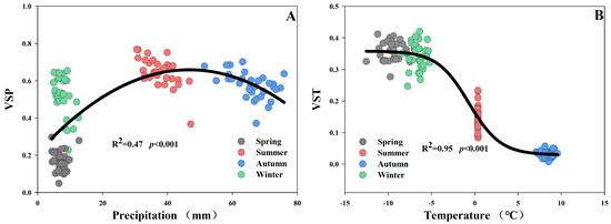 On the spatial scale, the regression analysis showed a quadratic curve relationship between the precipitation and VSP (y = −0.0002x2 + 0.02x + 0.21, R2 = 0.47, p < 0.001) (Figure 4A), indicating that when the values of precipitation are approximately 48 mm (summer and autumn) the VSP will be maximized, but the change rate is minimal. This differs from the relationship between temperature and VST, where VST decreased significantly with the increased temperature (, R2 = 0.95, p < 0.001). Interestingly, the change rate of VST sharply decreased when it exceeded the critical threshold (0 °C, summer) (Figure 4B).