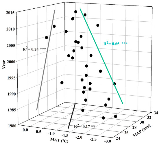 Relationships of MAP, MAT, and years during 1982−2013. The gray, green, and black solid lines represent the fitting lines of MAP and Year, MAT and Year, and MAP and MAT, respectively. *** represents the significance at the 0.001 level; ** represents the significance at the 0.01 level.