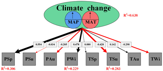 SEM was used to analyze the direct and indirect effects among variables in the Tibetan Plateau. The standardized total coefficients are listed on each path. The thickness of the solid arrows reflects the magnitude of the standardized SEM coefficients, the black solid line represents the positive effect, and the red solid line represents the negative effect. MAP and MAT represent the mean annual precipitation and mean annual temperature, respectively; PSp, PSu, PAu, and PWi represent vegetation sensitivity to precipitation in spring, summer, autumn, and winter, respectively; and TSp, TSu, TAu, and TWi represent vegetation sensitivity to temperature in spring, summer, autumn, and winter, respectively.