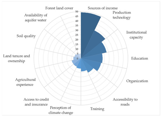 Economic resources. The economic factor of farmers is decisive for achieving adaptive capacity and is largely related to the diversification of income sources or livelihoods [50,53,54]. According to some studies, households that receive income from various sources have greater security to make decisions and face the challenges and impacts resulting from changes in climate and allow them to develop adaptation strategies [55]. In contrast, people with limited options for earning income have been shown to be more vulnerable [56]. In this regard, the literature suggests that smallholder farmers or subsistence-based ones who rely solely on primary activities are often people with very low adaptive capacity [1,25,50].