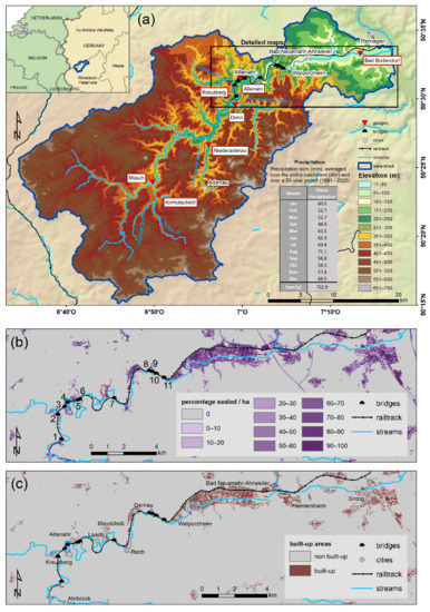 (a) Overview map of the Ahr river catchment indicating the locations of the mentioned towns, gauging stations and tributaries, and detailed maps of the distribution of sealed (b) and built-up areas (c), which only show the lower part of the catchment served by the Ahr valley railroad. The inserted table in the overview map (a) shows the precipitation sum per month and year, averaged over the entire catchment area of the Ahr River and over a 30-years period between 1991 and 2020.