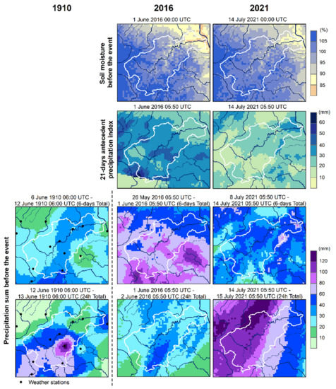 Comparison of hydrometeorological conditions before the precipitation event expressed as soil moisture (in usable field capacity (%)) from AMBAV model [25,26] and 21-days antecedent precipitation index (API) based on RADKLIM data [30] for the flood events in 2016 and 2021. Precipitation totals (mm) are presented for the events 1910, 2016 and 2021 for six days and one day before the event, based on RADOLAN data [27]. Note that the source of the precipitation values for 1910 is different, gridded station data instead of radar data, resulting in the coarser effective resolution.