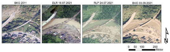 The mapping of damages focused on the railroad infrastructure and fluvial morphological changes in the Ahr River in the lower part of the valley (Figure 1). Three aerial photographs taken at different times after the event were used for mapping (Figure 3): (1) aerial photograph from the German Aerospace Center (Deutsches Zentrum für Luft-und Raumfahrt, DLR), taken on 16 July 2021; hereafter referred to as “DLR_16.07.2021” [37]; (2) aerial photograph from the State Office for Surveying and Geographic Information Rhineland-Palatinate (Landesamt für Vermessung und Geobasisinformation Rheinland-Pfalz), taken on 24 July 2021; hereafter referred to as “RLP_24.07.2021” [38]; (3) aerial photograph from the Federal Agency for Cartography and Geodesy Bundesamt für Kartographie und Geodäsie), taken on 3 September 2021; hereafter referred to as “BKG_03.09.2021” [39]. Thus, damage and fluvial morphological changes could be derived for short and longer periods.