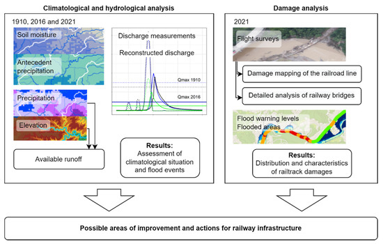 In contrast to river floods, the enormous erosion potential in catchments contributes significantly to the extent of damage to infrastructure in valleys. This paper investigates the impact of the heavy precipitation event of 14–15 July 2021 on the railroad in the Ahr valley in Rhineland-Palatinate, Germany. In a first step, a detailed overview of the climatological and hydrological drivers using spatially high-resolved precipitation distribution and peak discharge modeling is provided, and the event is placed in a broader context by comparing it to past flash flood events from 1910 and 2016. In a second step, a detailed mapping of damages along the railroad line is performed using aerial photographs. The mapping revealed that bridges are the weakest point during a flood event and that they contribute to an increase and modification of the flood wave through backwater effects. Since flood events are expected to increase in the future, there is an urgent need to increase the resilience of transportation to this hazard and to answer the question of what magnitudes and return periods of events should be used in future sizing of rail infrastructure.