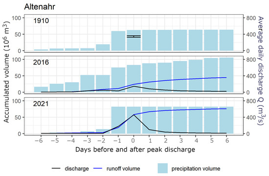 Accumulated precipitation values in the catchment above and discharge values at the gauging station in Altenahr during five days before and after peak discharge for the three flood events in June 1910, June 2016 and July 2021. As for 1910 no discharge measurements are available, the peak discharge is presented as a point, derived from the reconstruction of Roggenkamp and Herget [19]. The reconstructed discharge values for 2021 are from LfU [36].