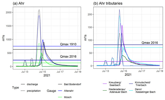 Discharge and precipitation values for the 2021 event at different gauging stations on the Ahr River (a) and selected tributaries (b). Peak discharge values (Qmax) for the events in 1910 and 2016 are integrated as horizontal lines.