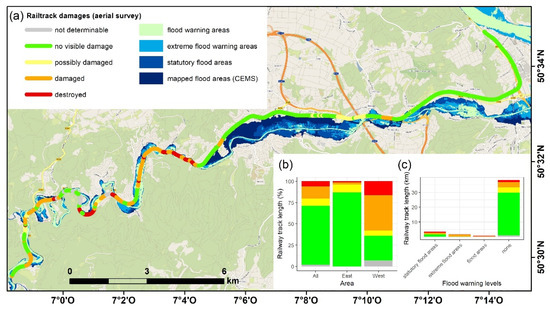 (a) Damage mapping on the railroad line for the sections Ahrbrück–Walporzheim (west) and Walporzheim–Bad Bodendorf (east) based on the aerial photograph RLP_24.07.2021. Designated flood zones are registered along the Ahr River based on the legally defined and reported floodplains as well as flood hazard maps issued and published by the Ministry for Climate Protection, Environment, Energy and Mobility Rheinland-Pfalz [15]. The diagram shows the percentage of the different damage categories for the whole railroad line as well as separate for the western and the eastern section (b) and compares the classified damage categories with designated flood warning levels (c).