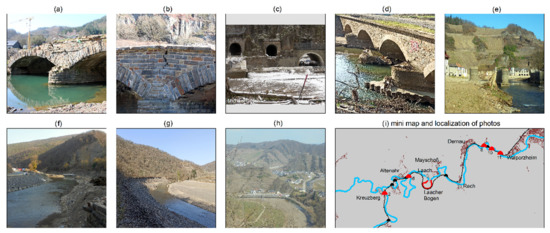Examples of observed damages and fluvial morphological changes along the railroad line. (a) Damages on bridge 2 through backwater effects. (b) A crack in the foundation of bridge 2. (c) Remains of the two-lane bridge 5. The cycling path went into the tunnel on the left, the railroad line into the tunnel in the middle. The tunnel on the right is the lower lying road tunnel, through which flowed parts of the discharge. (d) Damaged pier at bridge 8. The damaged pier was located on the river bank before the event; the course of the Ahr River ran only through the two front arches. (e) Remains of bridge 10 with a missing pier in the middle of the riverbed. (f) Location of the removed bridge 11 at the narrowest point of the Ahr valley. The road’s retaining wall (left) was eroded by the flood event. (g) The cut bank of the meander “Laacher Bogen” with strong lateral erosion, undercutting the railroad embankment. The route of the railroad line is indicated by the masts. (h) The meander neck at Laach, where parts of the flood wave shortened the meander bench, following the road (ancient railroad track). (i) Mini map providing an overview of the localization of the photos.