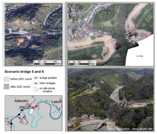 Aerial views before (left, [40]) and after (right, [37]) the event and a photograph illustrating the special situation at bridges 5 and 6 where the drainage situation was partially reversed due to the lower road tunnel.