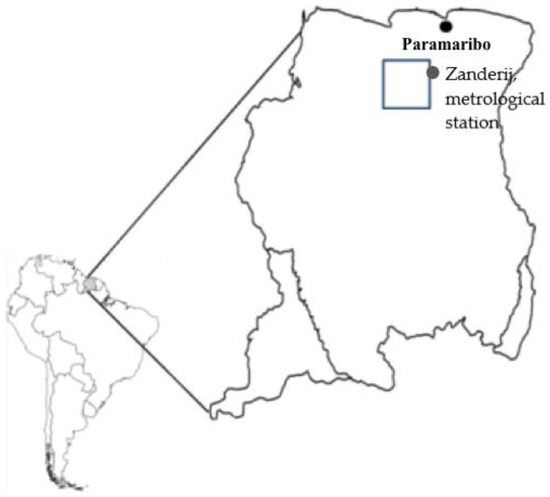 Map of Suriname showing the sample collection site and the metrological station, Zanderij. The square shows the origin of the samples.