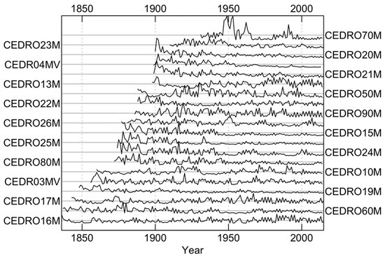 The correlation of each series with the master series is presented in Table 1 for time segments of 50 years. Nonsignificant correlations were observed for three segments (CEDRO16M: 1875–1924; CEDRO17M: 1875–1924; CEDRO4MV: 1925–1974). In dendrochronology, it is good practice to remove tree-ring series that show low correlations with the master series to maximize the common signal of the series used for building the chronology [25,68]. We decided not to truncate the tree-ring series by eliminating series with low correlations. This maintains the variability of tree growth and results in conservative estimations of climate–growth relationships [27].
