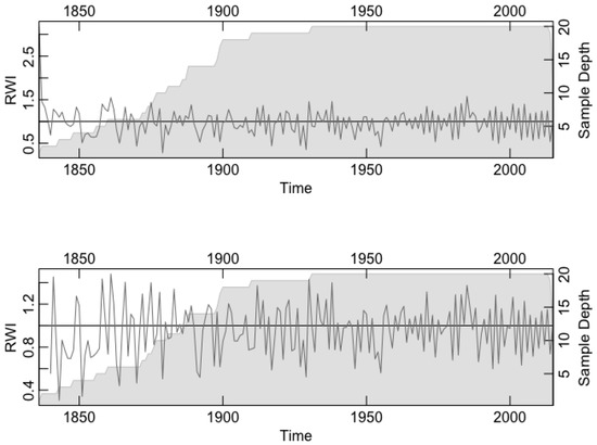 In order to eliminate the impact of biological factors on tree-ring growth pattern, the raw tree-ring series were detrended and standardized, and the residual master chronology was built [60]. Figure 5 shows the standard chronology using Tuckey’s biweight robust mean [69] and the residual chronology using the residuals of an AR process. Values presented are the dimensionless ring-width index (RWI) and the sample depth over time.
