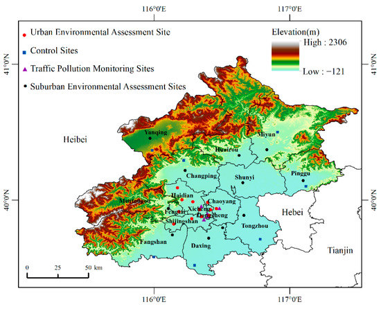 Beijing is the political, economic, and cultural center of China, and the condition of the air quality has caused widespread concern within the society and government. Wang et al. [1] noted that the Beijing–Tianjin–Hebei region, north of the Yangtze River and east of the Hu Huanyong Line, is one of the most polluted regions in China. PM2.5 is particulate matter with a kinetic diameter of less than or equal to 2.5 μm in the atmosphere, also known as atmospheric fine particulate matter. PM10 refers to particulate matter with a kinetic diameter of less than or equal to 10 μm in the atmosphere, also known as inhalable particulate matter. PM2.5 and PM10 affect atmospheric visibility by affecting the scattering of light and reducing the contrast between the target and the atmosphere. Moreover, the radiation balance is affected by the scattering and absorption of particulate matter, which in turn affects the global climate [2,3,4]. Heavy metals in PM2.5 have significant carcinogenic and non-carcinogenic risks, which seriously affect human health [5,6,7].