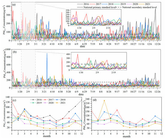 Distribution of daily (a,b) and monthly (c,d) average PM2.5 and PM10 concentrations from 2016 to 2021. The subplots in figures (a,b) show the changes in PM2.5 and PM10 during the COVID-19 epidemic lockdown in Beijing (24 January–29 February 2020), respectively.