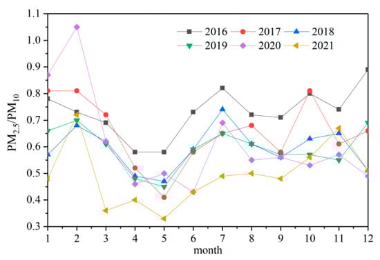 PM2.5 is characterized by its small particle size, large specific surface area, long residence time in the air and the tendency to carry harmful substances on its surface. PM2.5 is the smaller particle size fraction of PM10, the ratio of PM2.5 to PM10 mass concentration indicates the proportion of fine particulate matter to inhalable particulate matter. The overall performance of the PM2.5/PM10 ratio is wavy on the monthly scale from 2016–2021. As shown in Figure 3, the ratio of PM2.5/PM10 is very high in July, October and December, whereas the ratio is lowest in May, which is less than 0.6. The PM2.5/PM10 ratio decreases in Beijing in spring when the wind speed is higher and the dusty weather is more frequent. The average PM2.5/PM10 ratios for 2016–2021 are 0.73, 0.65, 0.59, 0.59, 0.61, and 0.49, respectively. It shows a decreasing trend, exhibiting that the proportion of fine particulate matter in Beijing is declining.