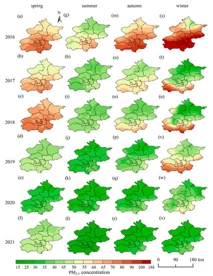 Spatial distribution of PM2.5 concentration in spring (a–f), summer (g–l), autumn (m–r) and winter(s–x) from 2016 to 2021, respectively. Unit: μg/m3.