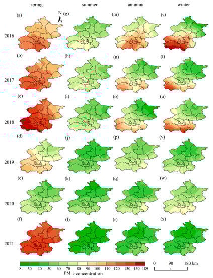 We apply the ordinary Kriging method to interpolate each discrete station to obtain the spatial distribution of PM2.5 and PM10 in Beijing from 2016–2021 (Figure 4 and Figure 5). PM2.5 concentration levels are generally higher in spring and winter than in summer and autumn, with significant seasonal differences. Additionally, it is an aggregation effect in areas with high mass concentrations. There is a significant decrease in PM2.5 concentrations in four seasons in 2020 and 2021. On the whole, the spatial pattern of PM2.5 concentrations distribution in Beijing over the last 6 years shows a gradual shift from “high in the south and low in the north” to a uniform homogenization across districts. As shown in Figure 4t–v, the regional differences are obvious in the winter of 2017–2019. Most parts of the southwest and southeast had concentration levels above 65 μg/m3, reaching maximum values above 100 μg/m3. On the contrary, the concentration levels in summer are lower than in other seasons, and regional differences are not evident. In conclusion, PM2.5 concentration levels have declined to varying degrees in all parts of Beijing, and the differences between districts are not significant in the last 6 years, especially in spring and winter.