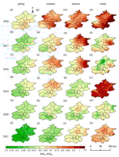 Spatial distribution of PM2.5/PM10 ratio in spring (a–f), summer (g–l), autumn (m–r) and winter(s–x) from 2016 to 2021, respectively.