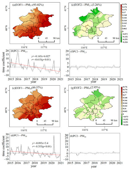 The first EOF patterns (EOF1) of PM2.5 and PM10 mass concentrations are covered by positive values, indicating that the spatial trends of these two particulate matters are synchronous. Specifically, the higher value area is located in the northeast of Beijing, and the lower value area is in the southwest. It can be seen by taking into account the time coefficients that the PM2.5 and PM10 concentrations show a decreasing trend from 2016 to 2021. Additionally, there are obvious seasonal oscillation characteristics, both have high concentrations in spring and winter and low concentrations in summer.