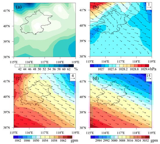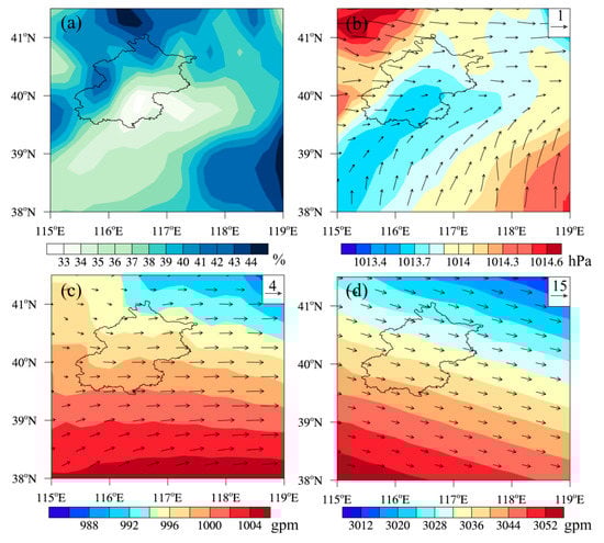 Circulation situation in winter 2016. (a) Near-surface relative humidity (unit: %); (b) Sea level pressure (unit: hPa) and near-surface wind field (unit:m/s); (c,d) 900 hPa and 700 hPa geopotential height field (unit: gpm) and wind field (unit: m/s).