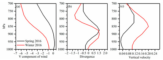 Regional mean vertical profiles for Beijing in spring and winter 2016. (a) refers to the meridional wind (unit: m/s), (b) is the dispersion(unit:10−5/s), and (c) is the vertical velocity (unit: Pa/s).