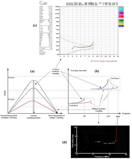 Principle and output results of the VI and OI sounding systems: (a) the VI and OI sounding principle; (b) formation principle of the VI and OI sounding ionograms; (c) an example of the VI ionograms from Beijing at 05:00, 25 March 2016; (d) an example of the OI ionograms from the Changchun-Jingyang circuit at 15:00, 1 December 2015.
