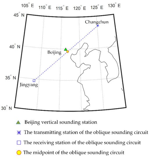 In this experiment, the Beijing ionospheric VI station is located at (39.9° N, 116.3° E), and the Changchun and Jingyang ionospheric OI stations are located at (43.5° N, 125.2° E) and (34.7° N, 108.8° E), respectively. By analyzing the distribution of these sounding stations, it was determined that the distance between the path midpoint (39.6° N, 116.5° E) of the Changchun and Jingyang circuit and the Beijing sounding station is 38.7 km. The location of the sounding station and the midpoint distribution of the OI sounding circuit is shown in Figure 2. In the figure, “o” marks the midpoint of the OI sounding circuit, “∗” is the transmitting station, and “□” is the receiving station. The Changchun–Jingyang path length is 1755 km, and the forward azimuth of the circuit is 208.4°.