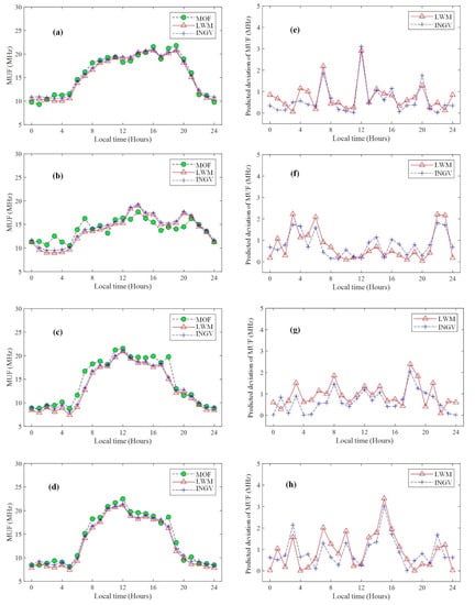 Comparison of MOF observations and MUF calculations from the LWM and INGV: (a) MOF and MUF calculations on 25 March 2016 (spring); (b) MOF and MUF calculations on 21 August 2016 (summer); (c) MOF and MUF calculations on 8 October 2016 (autumn); (d) MOF and MUF of on 25 December 2016 (winter); (e) Predicted deviation of MUF on 25 March 2016 (spring); (f) Predicted deviation of MUF on 21 August 2016 (summer); (g) Predicted deviation of MUF on 8 October 2016 (autumn); (h) Predicted deviation of MUF on 25 December 2016 (winter).