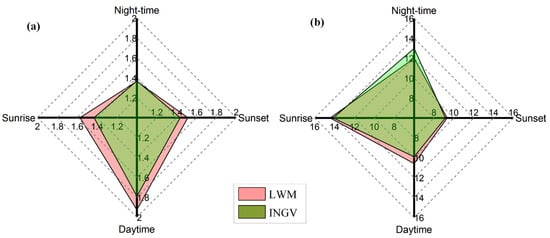 The above definitions are used to better analyze the variation of RMSE and RRMSEs in different seasons and periods. The total number of data points during spring, summer, autumn, and winter are 3543, 2614, 5060, and 3719, respectively. The total number of data points for the periods defined as sunrise, daytime, sunset, and nighttime are 1818, 5643, 2059, and 5416, respectively. Therefore, based on these definitions, we further analyze the error distribution characteristics of the LWM and INGV in different periods of four seasons.