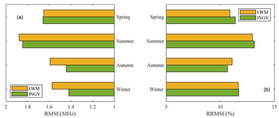 As shown in Figure 5a, the RMSEs of the LWM are 1.57 MHz, 1.93 MHz, 1.51 MHz, and 1.36 MHz at sunrise, daytime, sunset, and nighttime, respectively, and reach a minimum value at night. The RRMSEs of the LWM are 14.45%, 10.58%, 9.33%, and 11.99% at sunrise, daytime, sunset, and nighttime, respectively, and reach the minimum value at sunset. Similarly, the RMSEs of the INGV are 1.43 MHz, 1.79 MHz, 1.44 MHz, and 1.37 MHz at sunrise, daytime, sunset, and nighttime, respectively; and the RMSEs of the INGV are 14.14%, 9.90%, 9.14% and 12.98% at sunrise, daytime, sunset, and nighttime, respectively. It was found that the predicted results of INGV are more accurate than those of LWM, and the RMSE differences between the two models are 0.14 MHz, 0.14 MHz, 0.07 MHz, and 0.01 MHz at sunrise, daytime, sunset, and nighttime, respectively. As a result, the maximum difference of RMSE between the Lockwood and INGV model is 0.14 MHz (the INGV performs better than the LWM), with the corresponding differences of RRMSE being 0.31% at sunrise and 0.68% at daytime. It can be noted that the LWM performs better than the INGV only at nighttime, and the maximum RRMSE difference between the two models is only 0.99%.