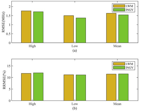 Considering the MUF statistics are influenced by the discretion of the solar activity, we divide the years 2015–2018 into relatively high and low solar activity epochs based on monthly mean sunspots []. The former includes 17 months from January 2015 to March 2016, May and August 2016, during which sunspot number was greater than 50; and the latter is 20 months from September 2016 to January 2018, April, June, and July 2016, during which sunspot number is less than 50 []. The total number of data points during these two solar activity epochs are 7684 and 7252. As shown in Figure 7, the RMSE of the INGV is at a minimum in low solar activity epochs, and is 1.37 MHz (RRMSE = 11.10%), whereas the RMSE of the LWM is 1.50 MHz (RRMSE = 11.16%). During high solar activity epochs, the RMSE of the INGV is 1.71 MHz (RRMSE = 11.99%), whereas that of the LWM is 1.76 MHz (RRMSE = 11.77%). On the whole, the RMSE of the LWM is all greater than that of INGV, whether in the solar high or low activity epochs. In contrast, the RRMSE relationship of the two models differs from RMSE in the solar high solar activity epoch. The mean difference of RMSEs between LWM and INGV is 0.09 MHz, and the mean difference of RRMSEs between LWM and INGV is 0.08%, which are very similar.