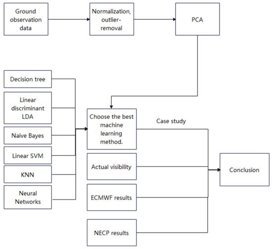 The method used in this study is illustrated in Figure 1. First, principal component analysis (PCA) was used to filter out features. The selected meteorological elements were used by classification algorithms to predict visibility. Then, algorithms with higher accuracy were screened out, and a confusion matrix was used. A foggy weather process was used to compare with the selected algorithms and numerical weather forecasting. The process used to verify this method is as follows: