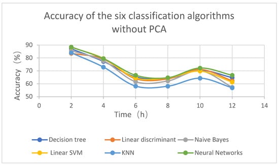 Figure 2 and Figure 3 show the accuracy rates of the six algorithms without and with the addition of the PCA; Table 3 is the exact number of Figure 2; Table 4 is the exact number of Figure 3. The accuracy rate represents the proportion of correctly classified samples to the total number of classified samples. The abscissa is the time from the initial data, and the ordinate is the accuracy of verification data.