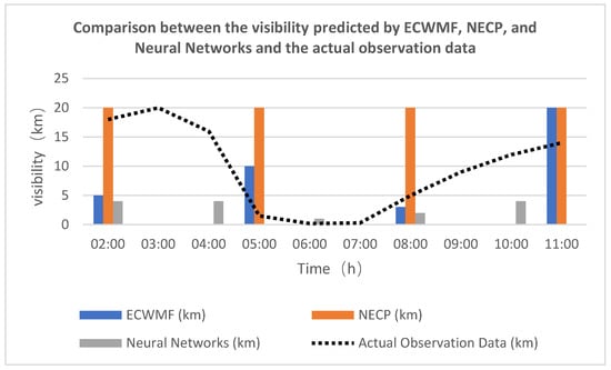 A day with foggy weather in Chengdu, 27 August 2021, was selected, and the visibilities predicted by ECWMF and by NECP were compared with those predicted using the Neural Networks algorithm and in the actual situation. The ECWMF, NECP numerical weather forecast, and neural networks time steps were 3 h, 3 h, and 2 h. Table 6 shows the initial data collection times of the three methods were all 20:00 on 26 August 2021. Figure 4 shows the calculation results.