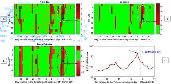 Figure 1a,b shows the variations of Kp and ap geomagnetic indices, respectively, during the period of 1 February to 21 March 2011. Please note we provide the values of the geomagnetic indices as binary, i.e., red for disturbed magnetic times and green for quiet magnetic times. The X-axis represents the days relative to the earthquake day. An asterisk indicates the earthquake time. The y-axis represents the local time. The choice of calm or perturbed magnetic times (and indices) was a-priori made and based on previous literature. It is seen that the Kp value reaches the values of 4, 4.5, and 5 between 02:00 and 06:00 LT on the earthquake day (the white dotted ellipsoid in Figure 1a). The ap value reaches the maximum value of 67 nT, 8 h before the main shock (the white dotted ellipsoid in Figure 1b). Figure 1c illustrates the variations of the Dst geomagnetic index during the period of 1 February to 21 March 2011. The Dst value exceeds the lower boundary value (i.e., −20 nT) at 16:00 LT, 1 day before the earthquake, and then gradually decreases and reaches the minimum value of −76.5 nT at earthquake time (the black dotted ellipsoid in Figure 1c). Figure 1d indicates the variations of solar radio flux (F10.7). F10.7 is often expressed in SFU or solar flux units. The F10.7 value gradually increased from about 14 days before the earthquake and reached the maximum value of 164.30 (SFU) on 8 March 2011 (the black arrow in Figure 1d), which is 3 days before the event. In addition to the notice that a few days before the large earthquake, there was a very disturbing magnetic period, we see that in the indices, there is an apparent cycle of around 10–15 days, which is practically half of the typical 27-day period of substorms. This relatively high frequency of occurrence of disturbed periods, with respect to the lower frequency of occurrence of large earthquakes, could produce an apparent correlation/anticipation of the disturbed magnetic days with the impending earthquakes.