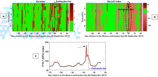 The high geomagnetic activities were clearly observed on 8 September 2017, when the Kp reached the maximum value of 8.3, between 12:00 and 15:00 UTC. The unusual variations of the Kp index are also seen on the earthquake day between 00:00 and 03:00 UTC with the value of 8.0. This index shows the highest geomagnetic activities on the earthquake date (the black dotted ellipsoid in Figure 2a). The abnormal Dst values are observed on the earthquake day when this parameter exceeds the lower boundary value (i.e., −20 nT), reaching the lowest hourly value of −142 nT and −128 nT at 02:00 and 03:00 UTC, respectively. Similar unusual variations are also seen at other times of earthquake date with the value of about −120 nT (the black dotted ellipsoid in Figure 2b). The F10.7 value gradually increased from about 14 days before the earthquake and reached the maximum value of 182.50 (SFU) on 4 September 2017, which is 4 days before the event (the black arrow in Figure 1c).
