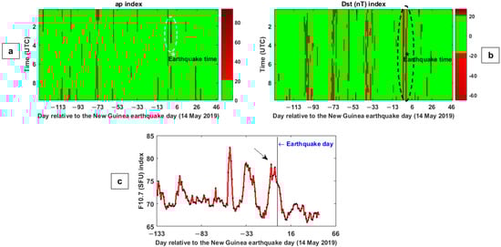 (a–c) shows, respectively, the variations of ap, Dst, and solar radio flux (F10.7) indices, respectively, during the period of 1 January to 30 June 2019. An asterisk “*” indicates the earthquake time. The dotted ellipsoids represent the conditions around the earthquake time. The dotted line represents the earthquake day. An asterisk indicates the earthquake time of New Guinea (14 May 2019). The values of the geomagnetic indices are given as binary, i.e., red for disturbed magnetic times and green for quiet magnetic times.