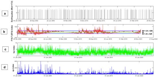 Time series of (a) global earthquake magnitudes, shown here for M ≥ 7.0 (b) dtrend daily average F10.7 (SFU) index, (c) daily average Kp index, and (d) daily average ap index, during the periods of 1 January 2000 and 28 April 2022.