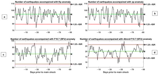 Figure 5a illustrates the number of earthquakes in which anomalous changes occurred in the Kp index. The abscissa represents the days relative to the earthquake day. Median and higher and lower bounds are drawn as green and red horizontal lines, respectively. The allowed ranges are defined as M ± 1.25 × IQR, in which M and IQR are the median and the inter-quartile range parameters, respectively.