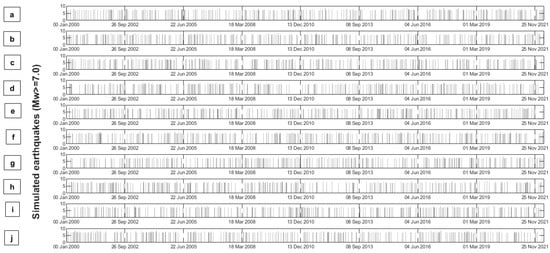 Panels (a–j) show an array of the first 10 simulated earthquakes dataset (out of 100 simulations) during the period of 1 January 2000 and 28 April 2022.