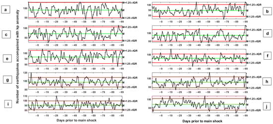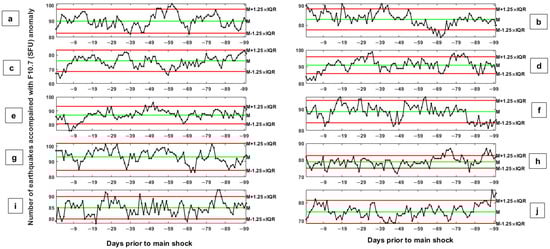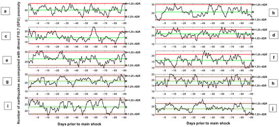 Panels (a–j) show results of 10 simulated earthquakes dataset. The y-axis in each panel indicates the number of simulated earthquakes accompanied by anomalous changes in the dtrend F10.7 index during the days prior to the simulated earthquakes. Median and higher and lower bounds are drawn as green and red horizontal lines, respectively. The allowed ranges are defined as M ± 1.25 × IQR, in which M and IQR are the median and the inter-quartile range parameters, respectively.