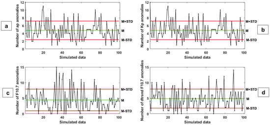 The number of detected anomalous anomalies for indices of (a) ap, (b) Kp, (c) F10.7, and (d) dtrend F10.7 after making 100 simulated earthquake datasets. Please note the x-axis here is the number of the simulation. “M” and “STD” are Mean and Standard Deviation parameters, respectively. Mean and higher and lower bounds are drawn as green and red horizontal lines, respectively. The allowed ranges are defined as M ± STD, in which M and STD are the mean and the standard deviation parameters, respectively.
