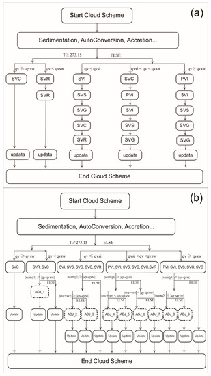 In the natural atmosphere, there are many categories of cloud particles with different sizes and phases. Each particle simultaneously undergoes mutual transition with water vapor through the processes of condensation/evaporation, deposition/sublimation, and nucleation. The treatments to the above transition processes in current cloud microphysics schemes differ in two aspects. First, different cloud schemes adopt different parameterizations, especially in the deposition and sublimation of ice-phase cloud particles, as well as the nucleation process. For example, much research has been conducted to reveal their impacts on the simulations of cloud and the QPFs [8,13,14,15]. Second, there are different treatments to the transition approaches of the WVRMPs and the corresponding tendency updates. According to the transition approach, the calculations for WVRMPs can be divided into the parallel-split transition approach (PSTA) and the sequential-update transition approach (SUTA). The PSTA assumes that the transitions between all hydrometeor particles and water vapor occur simultaneously; thus, the WVRMPs are calculated with the same humidity and temperature state. Usually, to ensure that the total amount of water in all transition processes is no more than the maximal condensable/depositable amount or maximal evaporable/sublimable amount within one timestep, a transition rate weighted method is applied to adjust each rate of the WVRMPs before updating their tendencies. The SUTA is based on the physical fact that the ease degree and the transition rate between cloud particles and water vapor are related to the scale size of cloud droplets; for example, cloud droplets are more likely to inter-transition with water vapor than raindrops at a faster transition rate. Therefore, the WVRMPs are calculated in order from small to large particles in the SUTA; meanwhile, their corresponding tendencies of temperature, water contents, and number concentrations are updated gradually one by one.