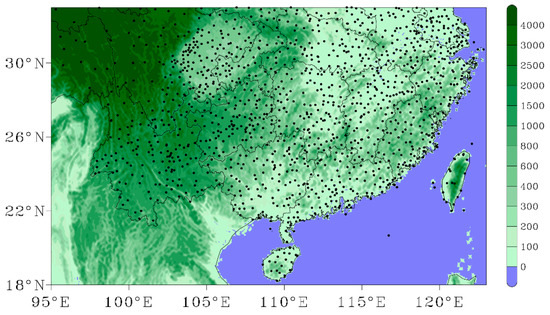 To quantitatively validate the daily amount of precipitation simulated by the two transition approaches in the double-moment microphysics scheme, a daily accumulated precipitation database from the CMA precipitation gauge network was employed in this study. The precipitation datasets are widely used in research, as applied by Su et al. [38]. There are a total of 1236 gauges in the simulation domain, as shown in Figure 2.
