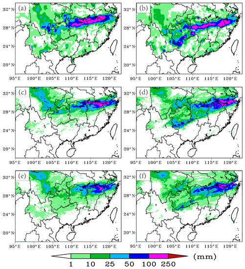(a,b) Observed and simulated (c,e) 24-h and (d,f) 48-h accumulated precipitation (unit: mm) from (c,d) the PSTA experiment and (e,f) the SUTA experiment initialized at 00:00 UTC on 23 June 2017.