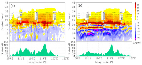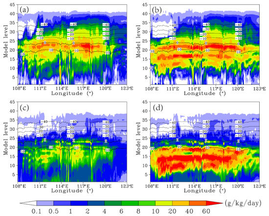 The surface precipitation amount is affected by the net transition rate between water vapor and hydrometeors. The net transition rate in the SUTA experiment is greater than that of the PSTA experiment, especially at the height between 0 °C and 10 °C. However, accompanied by more intense evaporation processes below the cloud base in the SUTA simulation, its surface precipitation amount is less than that of the PSTA, which is the same result as the difference between 24 h and 48 h surface accumulative precipitation (Figure 3). For the PSTA experiment, as shown in Figure 5a, it simulates more surface precipitation compared with the SUTA experiment in most of the region west of 118° E since its corresponding net evaporation rate below the cloud base is less than that of the SUTA. For instance, the precipitation values near 110° E simulated by the SUTA and the PSTA are 53 mm and 85 mm, respectively. At this location, the net evaporation simulated by the SUTA is over −40 g kg−1 d−1, while that by the PSTA is only about −10 g kg−1 d−1. To the east of 118° E, the precipitation simulated by the SUTA is slightly more than that by the PSTA, which is related to more condensation (deposition) in clouds and relatively less evaporation below the cloud base.